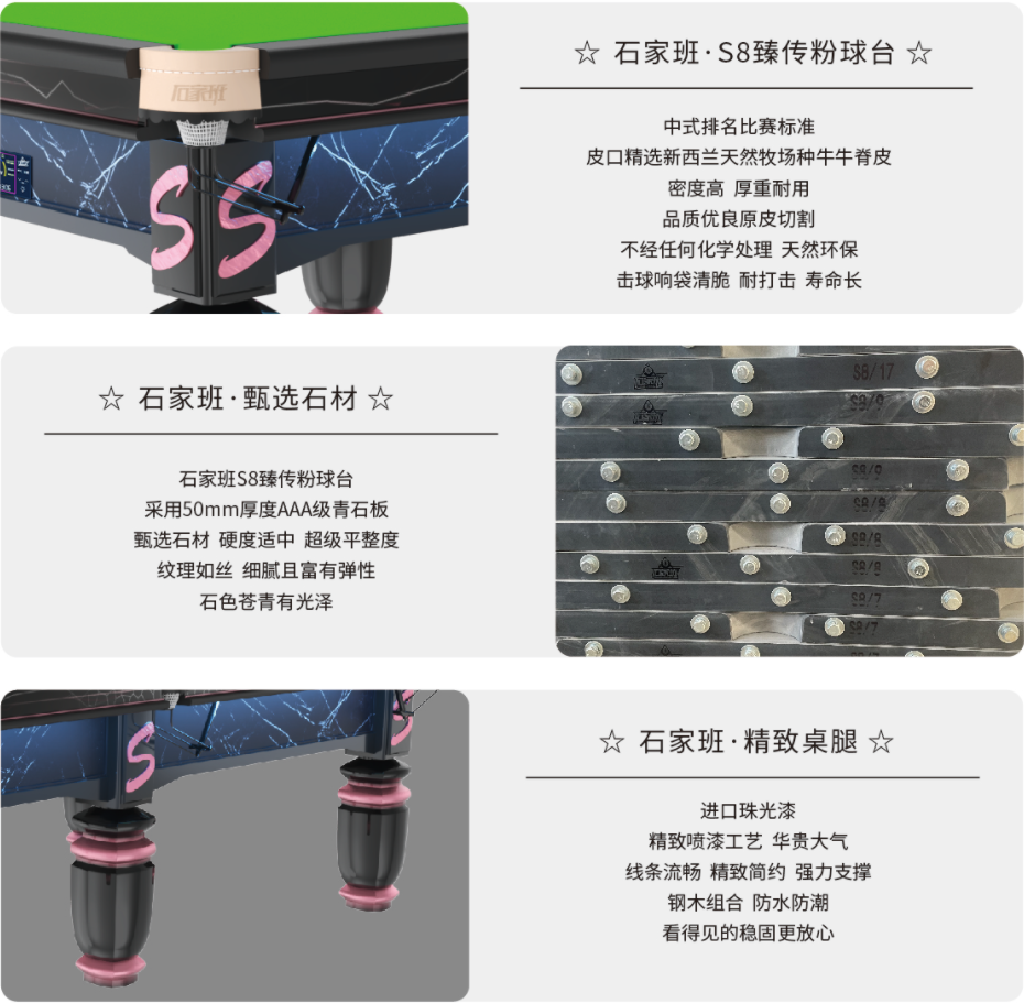 石家班S8臻传粉,这款融合传统古典匠心与现代科技美学的球台,现已正式上市,在此诚邀每一位台球爱好者共鉴臻品。
